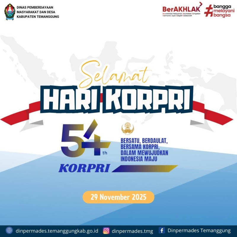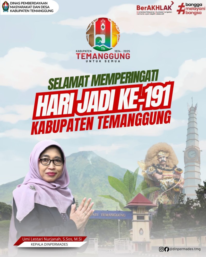 Kategori Lainnya Kategori: Lainnya Sekretariat 01 Januari 2026 10:00:00 20 Selamat Tahun Baru 2026 Selengkapnya Kategori: Lainnya Sekretariat 30 Desember 2025 09:29:00 19 Turut Berduka Cita atas berpulangnya Ibu Suningsih (Kadus Godegan Desa Jumo) Selengkapnya Kategori: Lainnya Sekretariat 23 Desember 2025 14:41:00 14 Turut berduka cita yang mendalam atas wafatnya almarhum Bapak Kusnan (Kadus Mrian Wetan Desa Kundisari). Selengkapnya Kategori: Lainnya Sekretariat 22 Desember 2025 14:42:00 12 Selamat Peringatan Hari Ibu ke-97 Selengkapnya Kategori: Lainnya Sekretariat 09 Desember 2025 08:53:00 33 Dinpermades Temanggung Lakukan Cek Lapangan Persiapan Liga Desa Selengkapnya Kategori: Lainnya Sekretariat 09 Desember 2025 08:46:00 34 Selamat Memperingati Hari Antikorupsi Sedunia (HAKORDIA) Tahun 2025 Selengkapnya Kategori: Lainnya Bidang Pemerintahan Desa 02 Desember 2025 08:58:00 26 Kabid Pemdes Laksanakan Monev dan Pembinaan Terkait Permasalahan PBB di Desa Karangseneng Selengkapnya Kategori: Lainnya Sekretariat 29 November 2025 10:40:00 22 Dirgahayu ke-54 KORPRI Selengkapnya Kategori: Lainnya Sekretariat 25 November 2025 08:30:00 15 Selamat Memperingati HARI GURU NASIONAL 25 November 2025 Selengkapnya Kategori: Lainnya Sekretariat 12 November 2025 08:28:00 28 Selamat Hari Kesehatan Nasional Selengkapnya Kategori: Lainnya Sekretariat 10 November 2025 08:23:00 34 Selamat Hari Pahlawan Nasional 10 November 2025 Selengkapnya Kategori: Lainnya Sekretariat 10 November 2025 08:22:00 33 Selamat Hari Jadi ke-191 Kabupaten Temanggung Selengkapnya 123NextLast