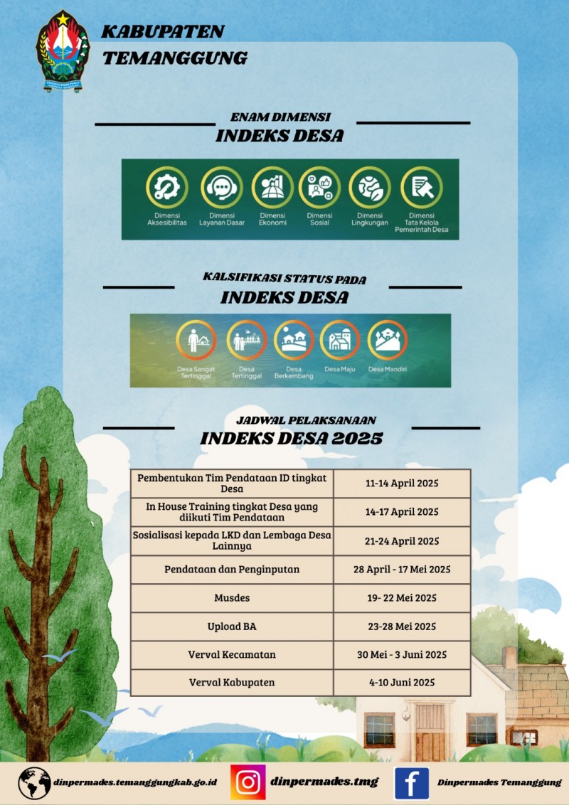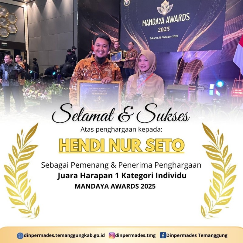 Kategori Pengumuman Kategori: Pengumuman Sekretariat 16 Oktober 2025 13:49:00 51 Pemenang dan Penerima Penghargaan Juara Harapan 2 Kategori Desa Selengkapnya Kategori: Pengumuman Sekretariat 16 Oktober 2025 13:48:00 51 Pemenang dan Penerima Penghargaan Juara Harapan 1 Kategori Individu Selengkapnya Kategori: Pengumuman Sekretariat 30 September 2025 10:41:00 55 Tupoksi Bidang PMD Selengkapnya Kategori: Pengumuman Sekretariat 26 September 2025 10:39:00 46 Layanan Aduan dan Aspirasi Dinpermades Temanggung Selengkapnya Kategori: Pengumuman Sekretariat 14 Agustus 2025 08:32:00 73 Semarak Lomba Dinpermades Selengkapnya Kategori: Pengumuman Sekretariat 21 April 2025 10:15:00 369 Selamat Hari Kartini Selengkapnya Kategori: Pengumuman Sekretariat 15 April 2025 08:57:00 149 Mari Kita Sukseskan Bersama Pelaksanaan Pendataan Indeks Desa Tahun 2025 Selengkapnya Kategori: Pengumuman Sekretariat 15 April 2025 08:56:00 154 Mari Kita Sukseskan Bersama Pelaksanaan Pendataan Indeks Desa Tahun 2025 Selengkapnya Kategori: Pengumuman Sekretariat 01 Juni 2024 15:04:00 256 Selamat Hari Lahir Pancasila. 1 Juni 2024. Selengkapnya Kategori: Pengumuman Sekretariat 31 Mei 2024 15:01:00 266 Masa Purna Tugas kepada Bapak Suryanto sebagai Pengadministrasi Pemerintahan Selengkapnya Kategori: Pengumuman Sekretariat 23 Mei 2024 07:56:00 254 Selamat Memperingati HARI RAYA WAISAK 23 Mei 2023 Selengkapnya Kategori: Pengumuman Sekretariat 20 Mei 2024 08:51:00 246 Selamat Memperingati HARI KEBANGKITAN NASIONAL 20 Mei 2024 Selengkapnya 123NextLast